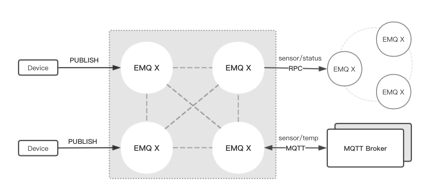 In addition, the EMQ X message broker supports multi-node bridge mode interconnection